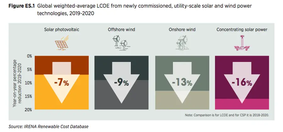 Nel 2020, il 62 per cento della produzione totale di energia rinnovabile aggiunta, pari a 162 gigawatt (GW), ha registrato costi più bassi del più economico nuovo combustibile fossile. L'energia solare a concentrazione (CSP) è scesa del 16 per cento, l'eolico onshore del 13 per cento, l'eolico offshore del 9 per cento e il solare fotovoltaico del 7 per cento.
