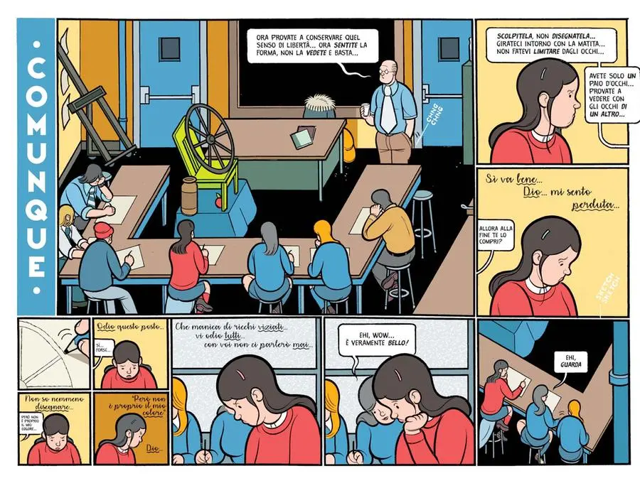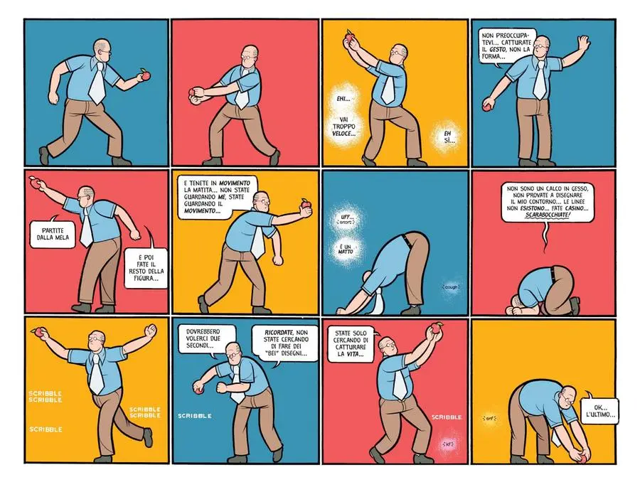 Queste indicazioni si traducono in una rappresentazione con una forte determinazione narrativa e con una forma grafica (che è anche contenuto, perché immagine essa stessa del senso della vita) che comprende: la stilizzazione dei personaggi, le tre dimensioni ortogonali (un realismo “tecnico”), la scelta dei colori, con uno spettro molto ampio, ma mai deciso e violento, le dimensioni variabili delle vignette (unico precedente consapevole: il milanese Guido Crepax), non sempre consequenziali o cinematografiche, spesso piccolissime per individuare dettagli perché fondamentali o perché banali, ma con lo stesso peso, oppure aperte su una o due pagine intere, sul paesaggio, sul contesto, come a ridefinire le giuste proporzioni.