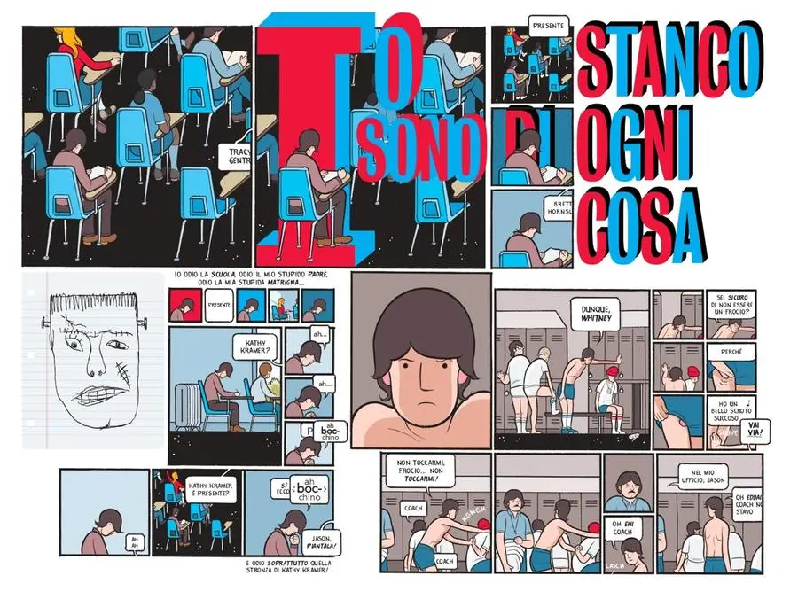 Rusty Brown entra in scena nella seconda pagina: un puntino colorato nella neve, a terra, vessato dai bulli. Il desiderio di un superpotere e il gioco con un supereroe sono emblematici del suo rapporto problematico con la vita reale.