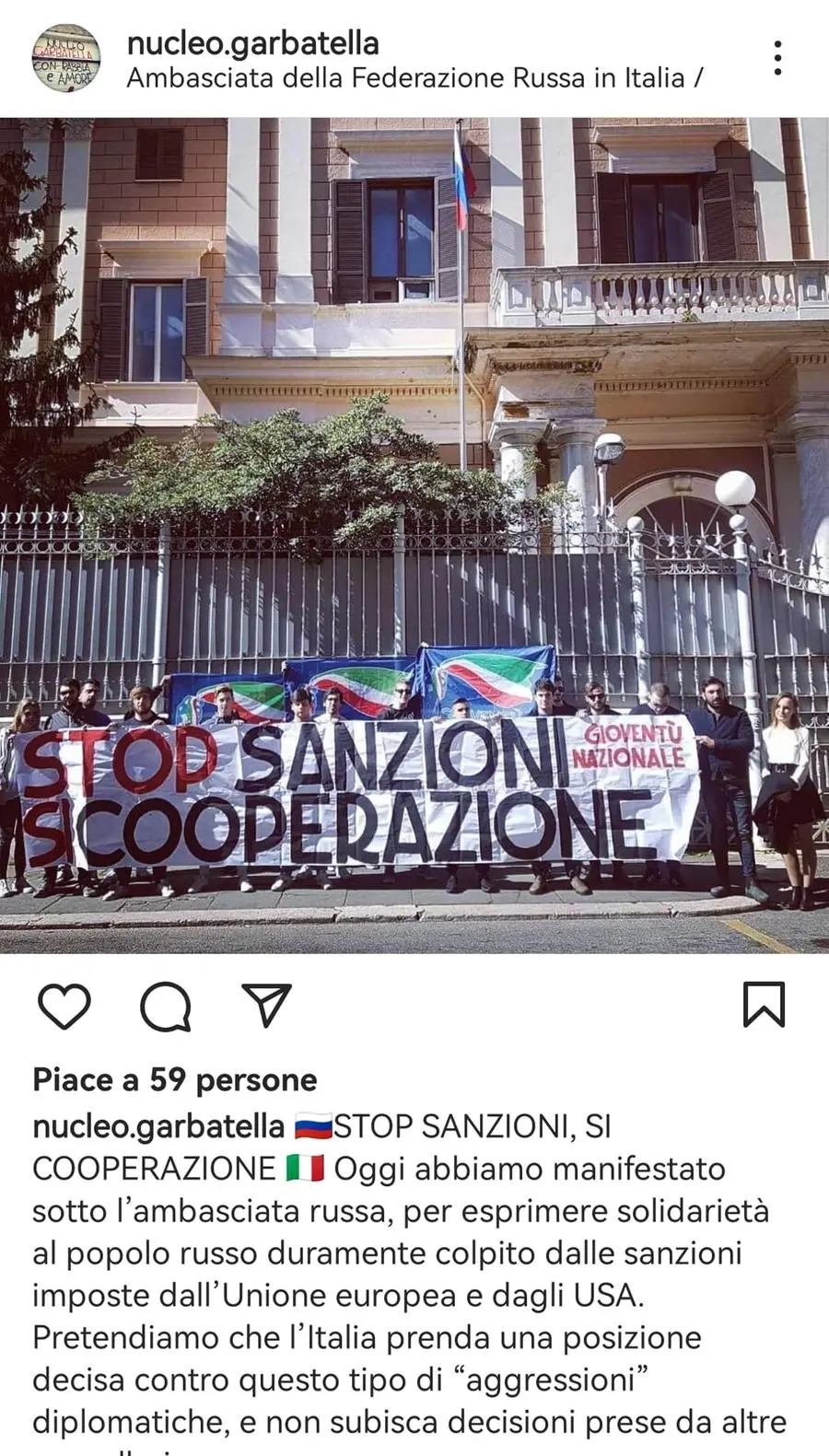 Sono le settimane in cui Azione giovani a Garbatella, la sede del suo quartiere dell’associazione che Meloni ha presieduto da giovane, organizza addirittura un flashmob davanti all’ambasciata russa. Il movimento si schiera dichiaratamente con «il popolo russo» e contro gli Stati Uniti e l’Europa.