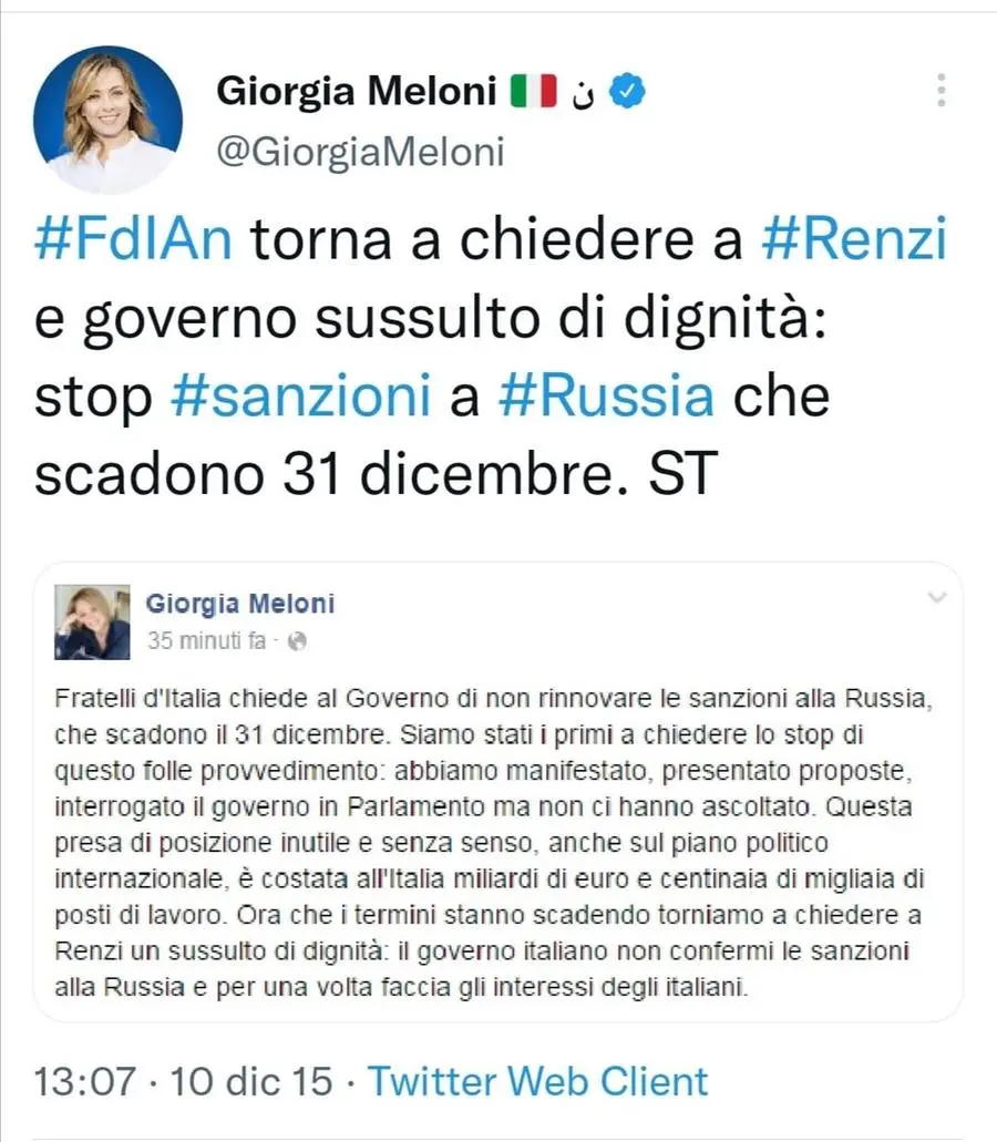 Ma la leader di Fratelli d’Italia non desiste. L’anno successivo tra Twitter e Facebook tornava a chiedere «un sussulto di dignità». E rivolgendosi all’allora presidente del Consiglio Matteo Renzi proponeva di non confermare le misure. Era il 10 dicembre 2015.