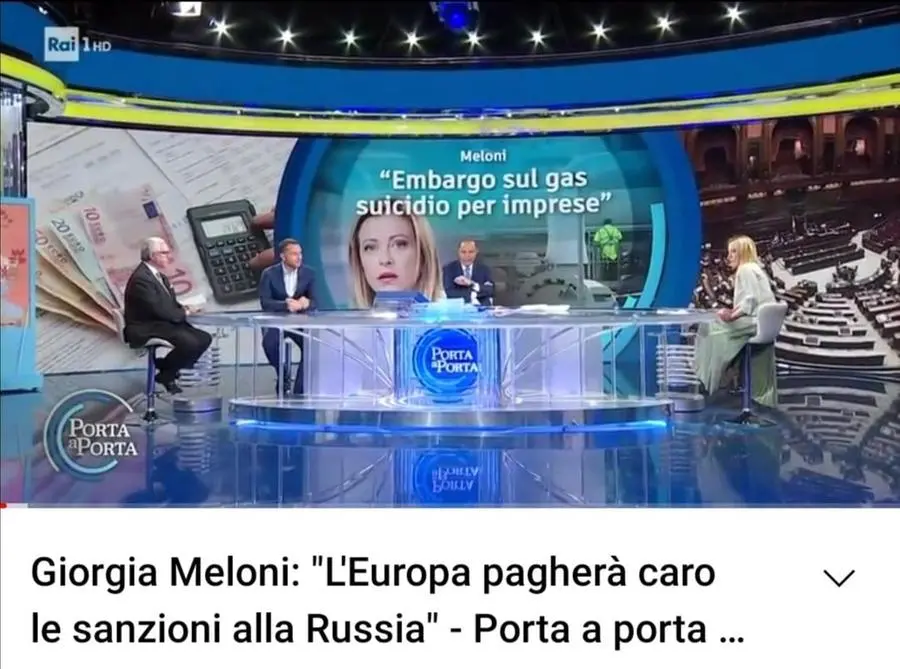 Meloni non era tanto convinta nemmeno subito dopo l’invasione dell’Ucraina nel 2022. A Porta a Porta ancora una volta le sanzioni non erano una mossa giusta da fare. E d’altronde l’8 febbraio, prima dell’invasione, era pacifista come Matteo Salvini: «Serve una pace secolare con la Russia ma mi sembra che Biden usi la politica estera per coprire i problemi che ha in patria». L’Europa «deve giocare un ruolo per la pace e avere una terzietà per l'Ucraina. Sono contro le sanzioni non perché sono amica di Putin, che non ho mai visto, ma il nostro interesse non è spingere la Russia verso la Cina». Più o meno le stesse parole che poi userà anche Silvio Berlusconi comprensivo col «signor Putin».