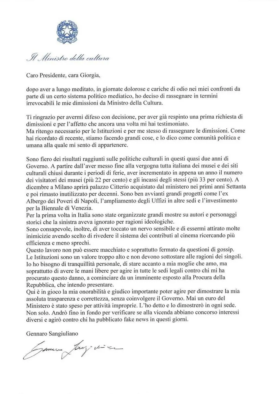 «Caro presidente, cara Giorgia, dopo aver a lungo meditato, in giornate dolorose e cariche di odio nei miei confronti da parte di un certo sistema politico mediatico, ho deciso di rassegnare in termini irrevocabili le mie dimissioni da Ministro della Cultura», ha scritto Sangiuliano nella sua lettera. Che poi ha annunciato: «Agirò contro chi mi ha procurato questo danno».